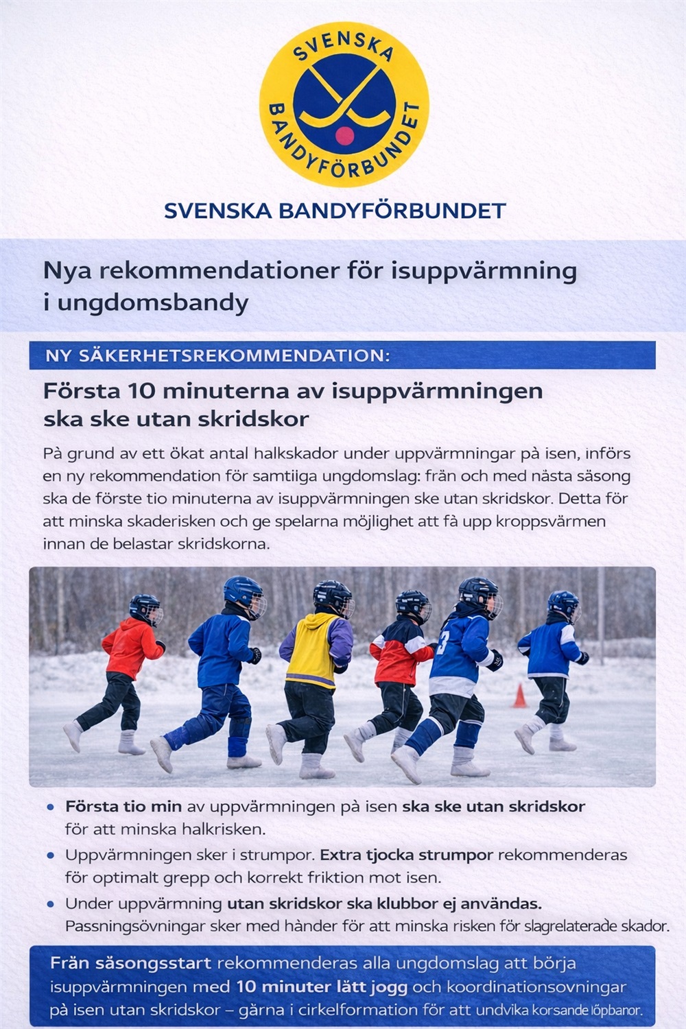 Svenska Bandyförbundet har gått ut med nya säkerhetsrekommendationer kring isuppvärmning i ungdomsbandy inför kommande säsong.